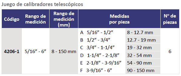 JUEGO DE CALIBRADORES TELESCOPICOS DE 5/16″»-6″» RANGO DE MEDICION 8-150MM