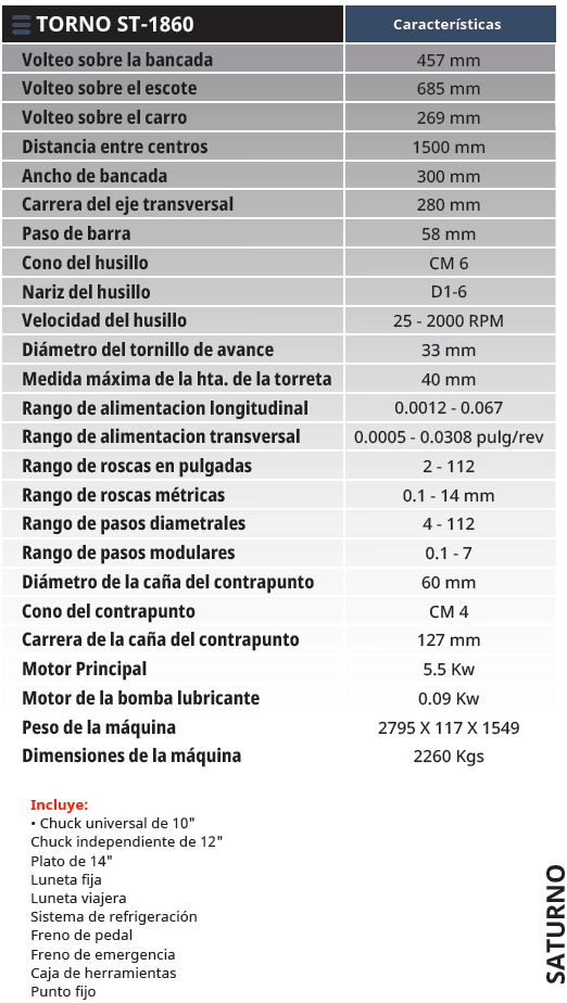 TORNO CONVENCIONAL SATURNO DE 460MM DE VOLTEO Y 1500MM ENTRE PUNTO CON 80MM DE PASO DE BARRA