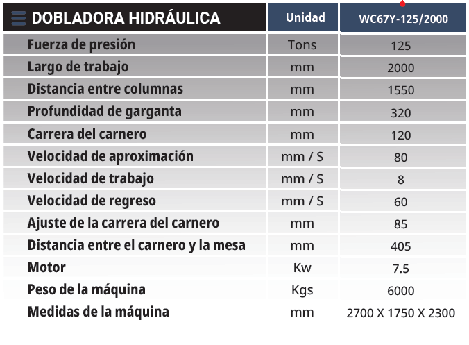 PRENSA DOBLADORA HIDRÁULICA CAPACIDAD DE 125TONS X 2000MM